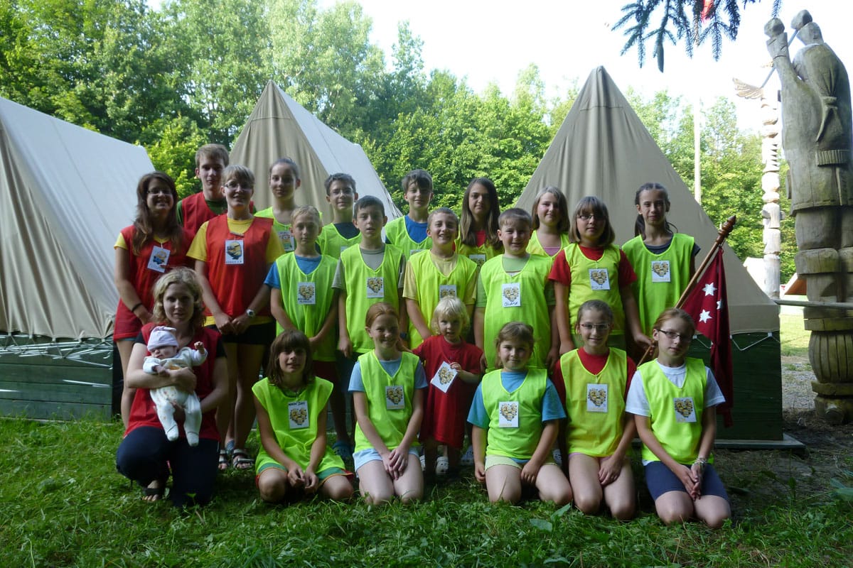 V létě jezdíme na tábor do Velkého Vřešťova. Každý rok je tábor nějak zaměřený a podle toho si vyrábíme kostými, trička a skládáme naši táborovou písničku. Je to takové hezké zakončení našeho celoročního scházení.